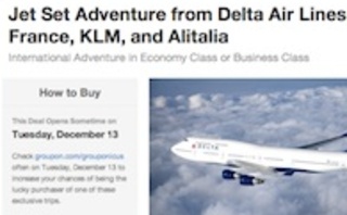 Groupon will offer three vouchers for trips around the world: one voucher is for business class air travel for two for a total of $20,000 and two vouchers are for coach flights for two people each at $10,000 per voucher. The deal goes live tomorrow.