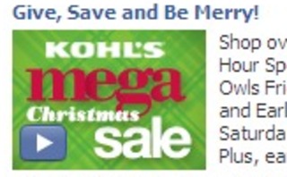 holidaysWhen it comes to Facebook ads, Kohl’s is off to an earlier start than Gap. The Menomonee Falls, WI-based retailer ran at least two creative variations of Facebook video promos yesterday. One involved the headline, “Give, Save and Be Merry!” The :15 spot pushed a “Mega Christmas Sale” for this Friday and Saturday. The other ad used the following text copy: “Shop the Mega Christmas Sale now through 11/13 to get $10 Kohl’s Cash for every $50 spent. Redeem Kohl’s Cash online starting 11/16!”