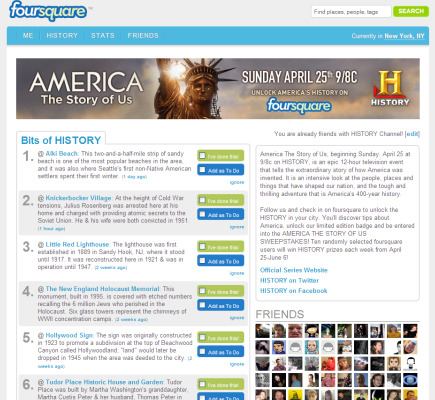 And here’s why. The New York-based cable network is providing Foursquare users with historical tidbits about the locations where they “check-in” around the country. According to a History Channel spokesperson, people who check-in at one of 1,000 landmarks in 19 cities will be served a historical tip about where they are.