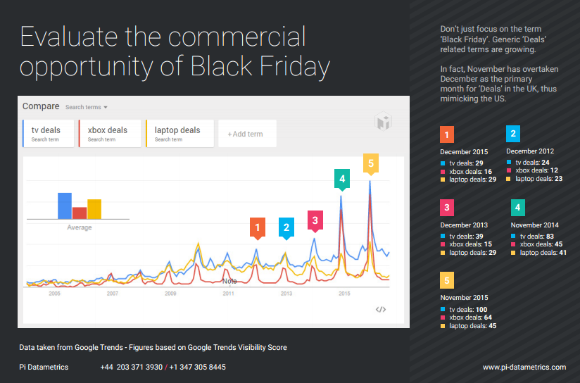 For example, the term “Black Friday” may have the highest search volume, but it’s the only the fourth most valuable search term on the day in the UK and the seventh most valuable term in the US.