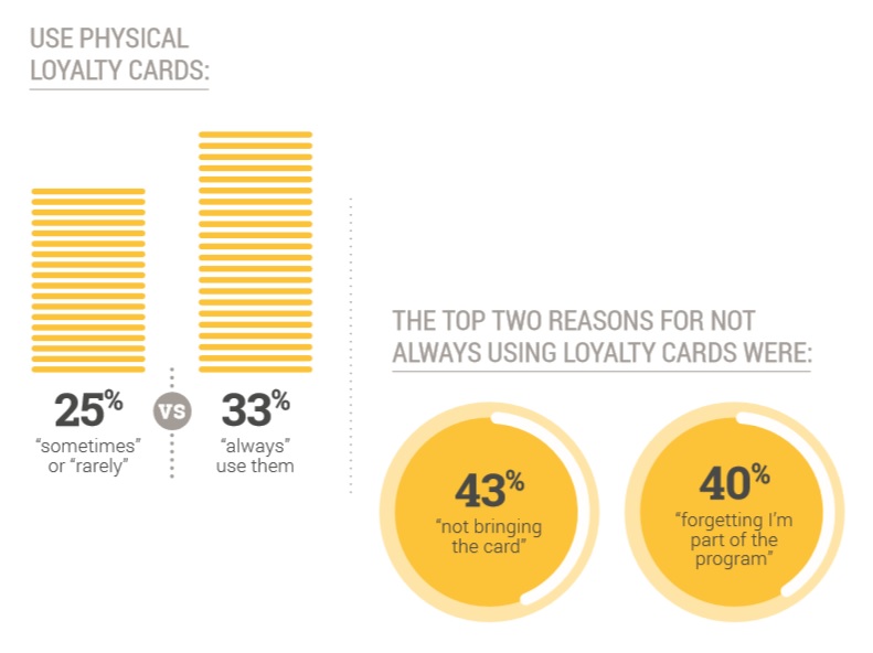 The two biggest problems cited with loyalty card programmes – consumers forgetting the card (43%) and forgetting they are members (40%) – could both be solved quite easily through using mobile wallets.