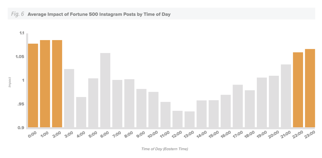 As with the most popular days of the week though, the competition does not guarantee the desired engagement during a busy time of the day, which is why the posts that are published between 10 pm and 3 am ET seem to have the highest impact or engagement among Fortune 500 brands.