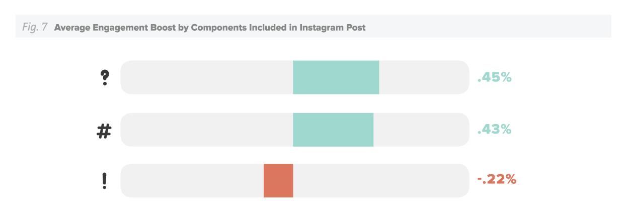 In fact, the posts from Fortune 500 brands that used hashtags or a question mark saw a significant higher engagement, while the exclamation point didn’t seem to help a post’s performance, reducing the engagement by 0.22%.