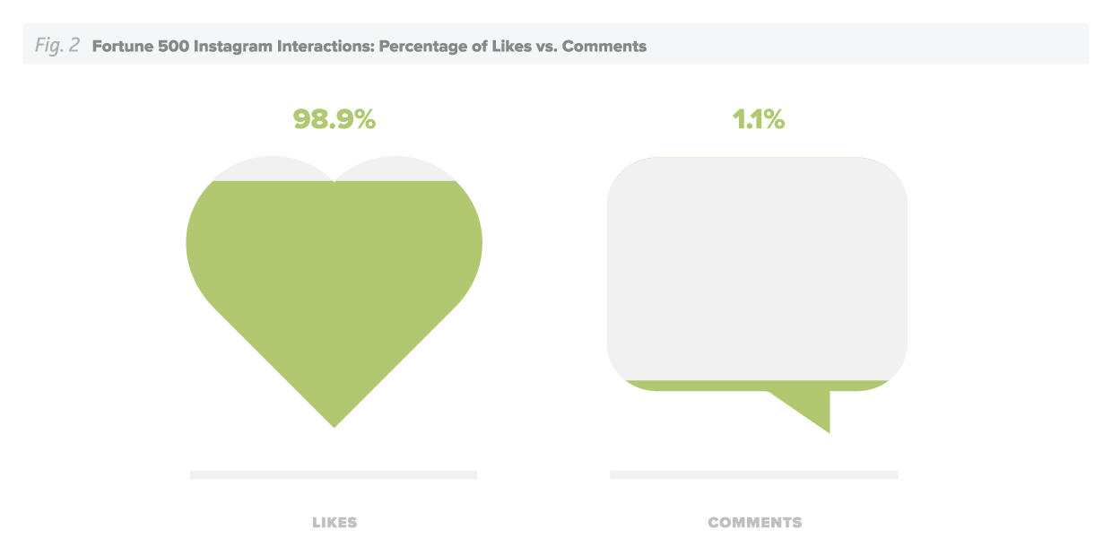 It is a very interesting observation to see that 98.9% of the interactions with Fortune 500 brands were in form of likes and just 1.1% of them being comments, which proves that users are often not engaged enough (or too lazy?) to actually leave a comment. They rather prefer to show their approval with a double tap, or else a like.
