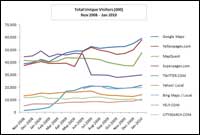 In terms of unique visitors, Google Maps leads the race and taking share from some IYPs. In the past, many of the IYPs relied heavily on favorable organic SERP (define) placement as a traffic driver to their local sites. Now that Google (and Google Maps) has increased its local search results, users don’t have to click through to the IYP sites.