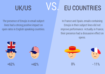 Using their database of over 15,000 respondents across European and US markets, Mailjet tested a number of different emojis against the open rates of marketing emails in each market. Low and behold Brits are in fact the most likely to open emails containing emoji’s, with an impressive 63% engaging via this approach.
