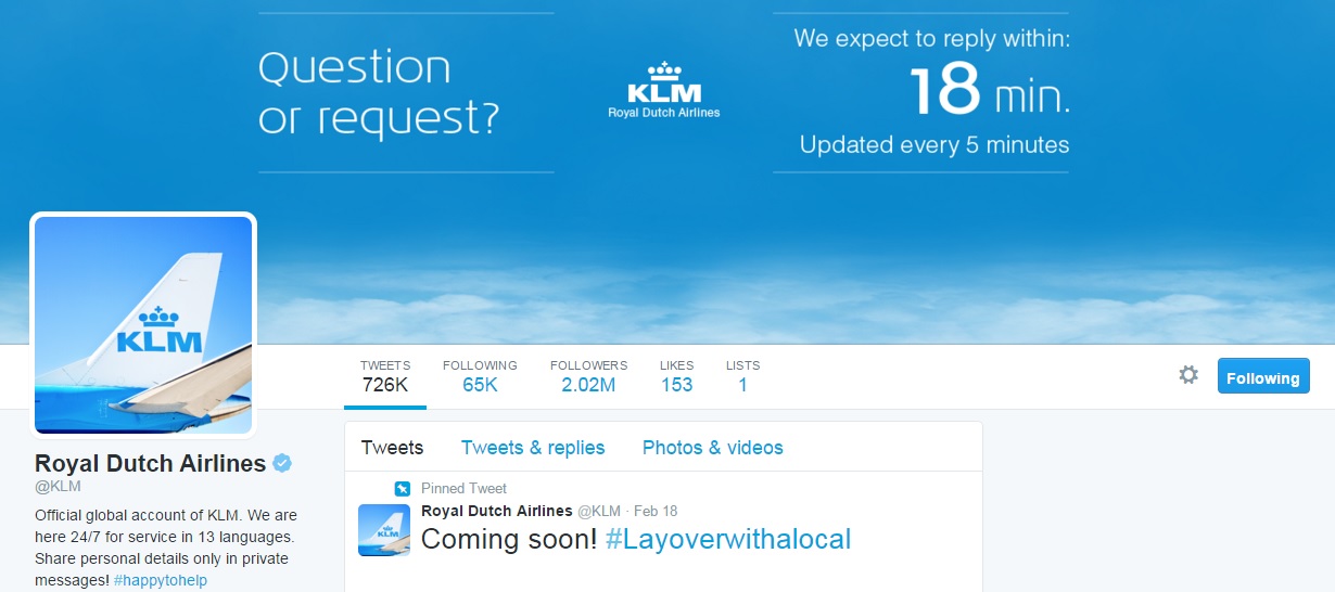 For example, Royal Dutch Airlines has established a dedicated customer service team on Twitter 24/7.