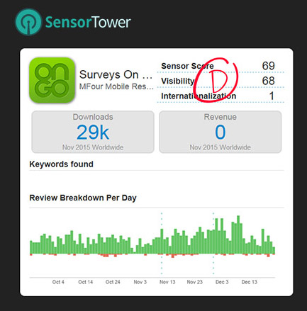 For any app, Sensor Tower estimates downloads and revenue, gives keywords and rates apps for overall performance, for visibility (how easy it is to find in the app stores) and international coverage.