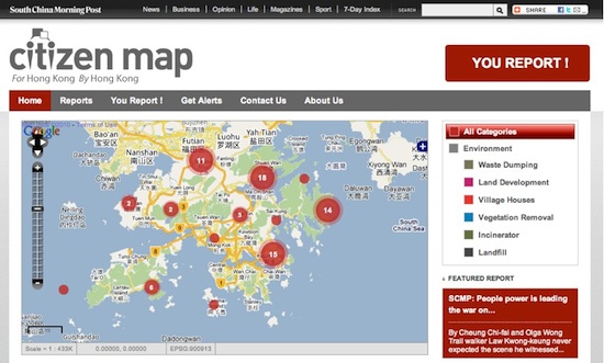 There are increasingly exceptions to this pattern. One of the more common exceptions is the use of maps. In the past few weeks, we have seen a couple of mapping driven news efforts that will bear watching. The first is South China Morning Post’s Citizen Map effort to pinpoint environmental issues in Hong Kong’s suburbs.
