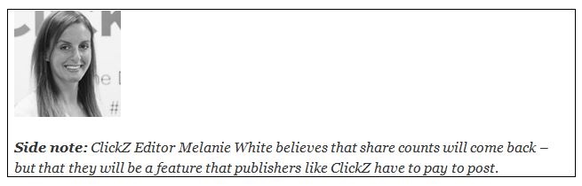 “They were really useful to us. Having share counts along with our comments section was a strong way to underline that there’s a conversation around what we’ve written, as well as letting us know that our content was resonating with readers. I believe it’s another desperate move by Twitter to increase revenues in the long term and I think it will be detrimental to its future,” said ClickZ’s Editor, Melanie White, on that move.