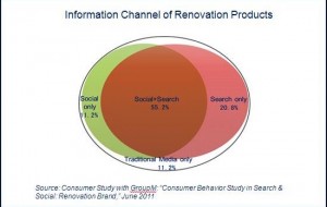 The China research revealed that when Chinese consumers search for renovation products, 55.2 percent of them search information using both search and social media while 20.8 percent use search only, 11.2 percent use social only, and 11.2 percent use traditional media only (Graph 2).
