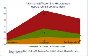 In our China study for the painting brand, the research finding showed that the effect of search plus social is greater than the combined effect of social alone plus search alone. From all three dimensions of brand awareness, reputation, and purchase intent influence, search combined with social has been proven to be the most effective in this study (Graph 4).