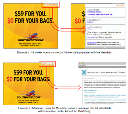 The guidelines allow some flexibility in how information about companies involved in serving a particular ad is presented to the consumer. The icon and accompanying text must be placed as an overlay in the upper right corner of a standard display ad or in the upper right corner outside the ad. Once clicked, the symbol will launch an interstitial revealing information about the advertiser, ad delivery firms, and targeting data, in addition to linking to educational information.