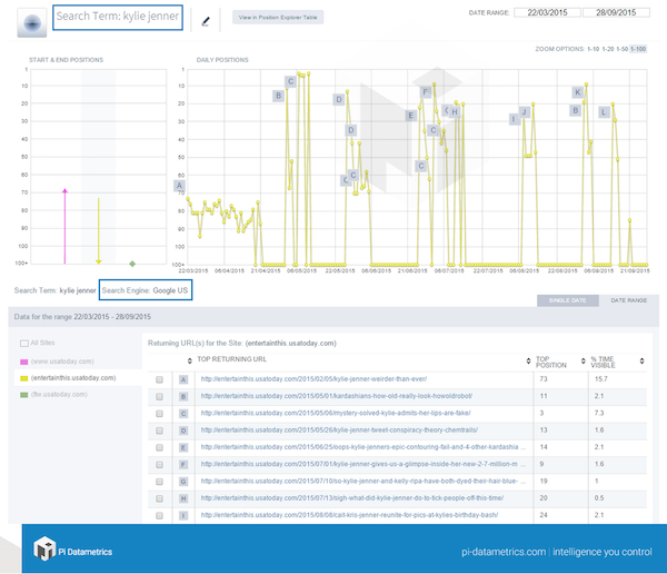 For example, USA Today has ten different articles ranking for the term ‘Kylie Jenner’ during a six month period last year. As each new one comes along, it battles with the existing article, with the end result being a very inconsistent search performance.