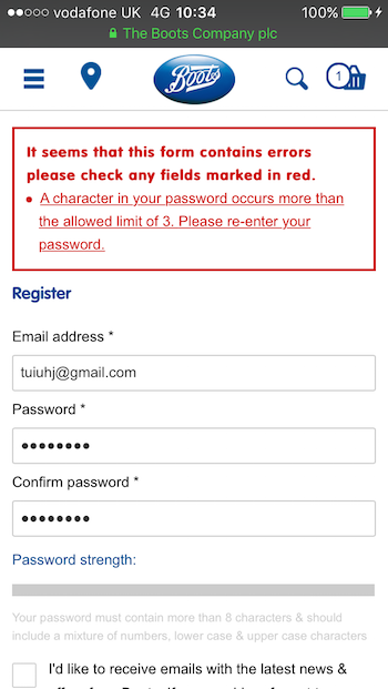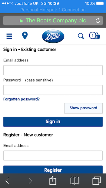 Let’s look at Boots’s mobile site. 50% of users struggled to create an account when testing.