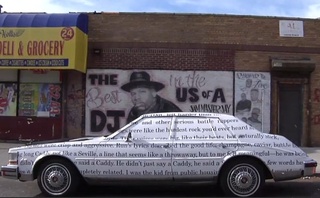 Each of the book’s 320 pages was printed and installed in a different spot across 13 major cities. Locations were selected based on the content of each page, so that a section dealing with Brooklyn would be installed in that borough, UK in London, and so on. They appeared on media as varied as rooftops, bus stops, a Cadillac, leather jacket linings, and restaurant plates.