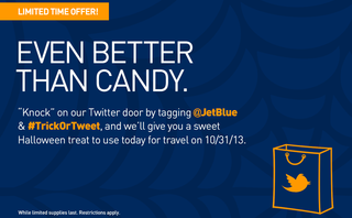 On October 21, JetBlue Airways celebrated Halloween early by giving out virtual treats to followers who tweeted with the hashtag #TrickorTweet.