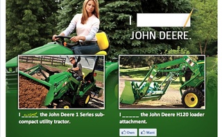 John Deere, looking to sell tractors and lawn mowers during spring, has added “want” and “own” buttons to its Facebook page, allowing consumers to express more specific interest levels in particular products. For instance, with either “want” or “own,” Facebook users can virtually fill in the following blanks: “I ____ the John Deere 1 Series sub-compact utility tractor”; and “I ____ the John Deere H120 loader attachment”.