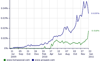 According to data from Hitwise, LivingSocial’s traffic surged 80 percent in the week beginning January 17, while visits to the Groupon site declined 20 percent in the same period. Although those gains are likely a direct result of the extremely popular Amazon promotion that ran that week, they imply that market leader Groupon may not have an insurmountable stranglehold on the space.