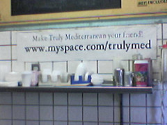 Spotted this in the Mediterranean food place next to where the EFF debate was held last night. It’s a small place and this was posted prominently enough that I saw it from outside the door. Now that’s a local merchant who “gets” online.