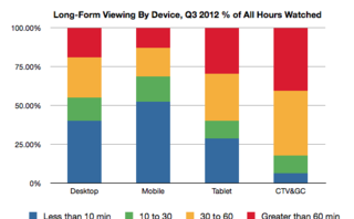 Ooyala also found an increase in long-form video viewing across devices, again with tablet owners leading the pack, spending 71 percent of their total video viewing time watching videos 10 minutes long or longer. Moreover, 30 percent of total tablet viewing time was spent watching content that was more than an hour long.