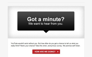 One way to extract this feedback is with a survey. YouTube recently sent out such a message to its email subscribers with the subject line, “YouTube Wants Your Feedback.” “YouTube wouldn’t exist without you,” the copy read, “But how often do you get a chance to tell us what you really think?” The correspondence gave site users the opportunity to offer anonymous feedback on the product and brand, and promised to take their opinions to heart. As an added bonus, a request that’s worded thoughtfully – as YouTube’s is – is apt to gain you some fidelity in addition to quantifiable comments.