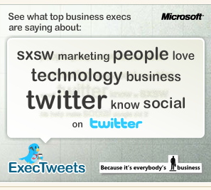 I thought this was worth noting. I was visiting the Wharton Business School’s Knowledge@Wharton site and spotted this ad for Microsoft’s ExecTweets. The Microsoft-sponsored ExecTweets site. launched in March, was developed by Microsoft and Twitter along with social media and ad company Federated Media.