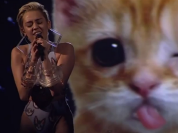 Her personal brand maybe one created out of confused rebellion, a hell of a lot of selfies, and naked grinding on a wrecking ball, but Miley’s latest performance at the American Music Awards proved that all she ever really needed was a giant, sad-looking e-kitten mouthing along the words to her songs to win over the hearts and minds of the online community.