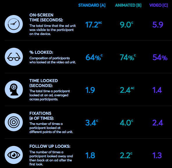 Static ads got the most screen time, which makes sense, given their smaller size, but animated ads got more views. Three-quarters of people actually looked at them. Animated ads also outscored their static counterparts in both positive (entertaining, engaging) and negative (annoying, interruptive) categories. However, the difference was far greater on the positive side. Why?