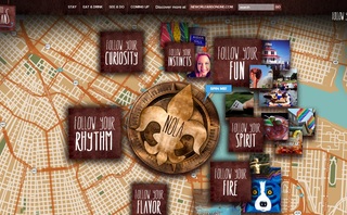 The campaign, which relies far more on digital marketing than in the city’s past promotions, began with the recent unveiling of a new experiential website with a whimsical layout designed to get people exploring the city. Using the slogan “Follow Your NOLA,” the centerpiece of the site is a fleur-de-lis – often viewed as a symbol for New Orleans – superimposed over an interactive map of the city. Clicking on the symbol pins it like a roulette wheel, allowing users to follow where it leads to explore seven different aspects of the city: rhythm, fun, curiosity, flavor, instincts, fire, and spirit.