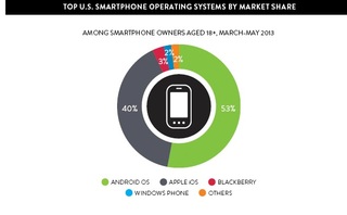 Android came out as the top U.S. smartphone operating system by market share, with 53 percent of consumers opting for Android OS handsets during the March to May 2013 period. But Apple kept its lead as the top smartphone manufacturer in the U.S., with 40 percent of consumers owning iPhones, up 7 percentage points from 2012. BlackBerry came in a distant third for operating system with 3 percent, and Windows Phone came in fourth at 2 percent.