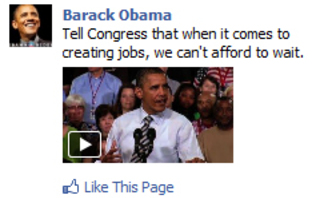 The Facebook ads encourage people to contact congress in support of President Barack Obama’s jobs plan. The ads link to a Facebook page featuring video of the TV spot; that page links to the Jobs Now page on the official site. According to reports, the campaign has run the jobs-related TV ads in nine swing states including Colorado, Florida, Iowa, North Carolina, New Hampshire, Nevada, Ohio, Pennsylvania, and Virginia.
