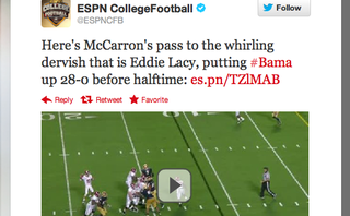 ESPN used tweet-embedded videos to promote live broadcasts of college football championship games, Theodore said. “Obviously, they want the fan experience to be on ESPN,” he said. “They set up a separate Twitter account, @ESPNCFB, tweeting out embedded instant replay clips to the live game, and all those clips had links back to the actual game. They used it almost like lead generation to harvest audiences to come to the live game.”
