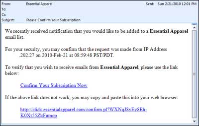 The e-mail I received (below) does state the need to confirm my subscription in the subject line. But does it really need to tell me the IP address, date, and time of the opt-in? This is important information for Essential Apparel to keep in case it is ever accused of spamming me, but it really has no place in a consumer-facing e-mail. Especially not above the information about how I can confirm that I want to be on the list.