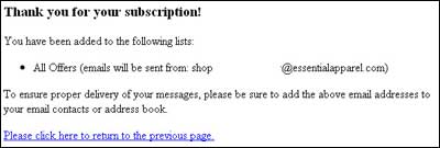 I like that they don’t dead-end people on this page – there is a link that looks like it takes you back into the Web site. But when I clicked on it – nothing happened. I didn’t go anywhere. This is likely because it’s set up to take you back to the “previous page” – and there is no previous page, since the visitor deep linked here from an e-mail. Essential Apparel should use a mechanism like it uses on the thank you page – a link or button that takes visitors back to shop.