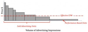 Each rectangle represents the total advertising revenue at a particular price for that period. Once you have fulfilled all sold CPM ad units, the continuing revenue opportunity is usually from ad networks like Google AdSense and AdBrite, performance-based units. The revenue on these ads is the marginal revenue for the incremental page view. Typically, the volume of these ad units is much larger than shown on this chart, large volume and very low prices. When you evaluate advertising loss, work backwards from the last unit served, losing the performance-based units first and then backing into the remainder of sold units. Applying your effective CPM will overstate the potential loss from narrowing your audience through a paid content program.