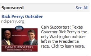 A post to Perry’s Facebook account displays an image featuring Cain and Perry, and also plays on the Texas Governor’s arguable outsider status. “Cain supporters: Join Team Perry,” it declares. Perry is also using Facebook ads to drive people to his new faith-centric TV spot on YouTube.