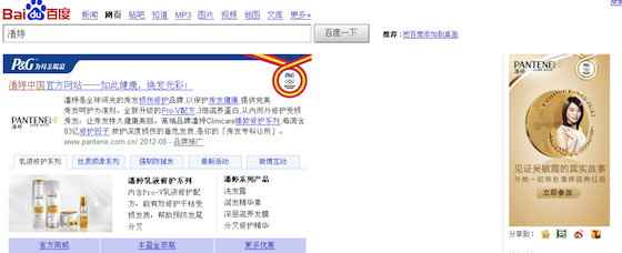 Search engine marketing: Pantene bought Baidu Brandzone and created a customized Baidu app on its SERP to drive users to its campaign site.