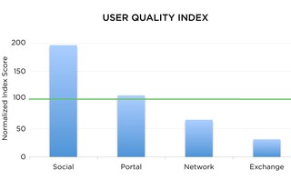 For example, looking at the cost metric, the Aggregate Knowledge report found that ad exchanges deliver clicks and conversions at the lowest cost. On the other hand, when viewed through the prisms of reach efficiency and user quality, social media performs more than 2.5 times better than the indexed average, while networks and exchanges perform 35 to 69 percent below the indexed average in reaching high-quality users that can consistently be marketed to. (To date, Facebook is by far the largest source of social media data in the database, although Gatto expects that to evolve over time.)
