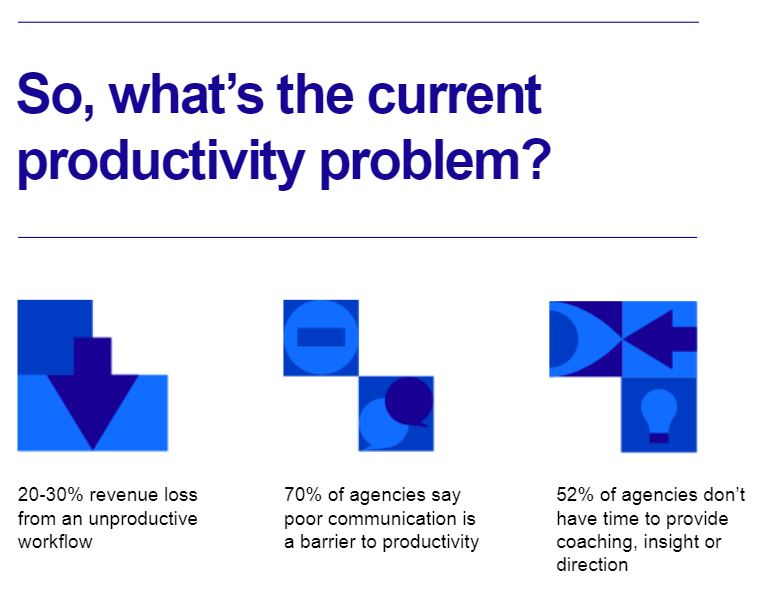 Agencies typically have three productivity zones. These include workflow, resource management and client relationships.