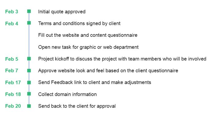 6. Lead your client from start to finish: The initial workflow begins when the quote is approved and should follow clear steps at regular intervals after that. A kickoff workflow might look something like this: