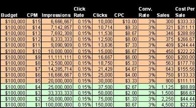 Below, you can see a predictive modeling table in chronological order of key performance indicator (KPI) metrics, from budget to cost per sale. The green zone represents CPMs and CPCs we can pay in this first round to come in below our $80 target. Pay any more than the highest rate in the green zone ($4), and it’s unlikely we’ll be successful. So you or the client may want the home page of CNET, but you won’t be successful if you can’t get it for a $4 CPM or less. (Notice the green zone goes up to a cost per sale of $88.89 — well, no one said we couldn’t push the envelope a little and hopefully lower CPMs — and CPC deals will pull the average down.)