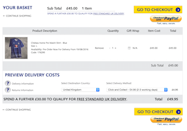 Delivery offerings aren’t always the most competitive though. Here, Chelsea charges £4.95 for standard delivery, and the same for click and collect, even though most retailers would offer this free of charge.