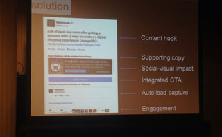 • Using his agency’s own study about Twitter’s lead generations cards, Lee showed how Twitter cards enabled an overall 996 percent increase in acquired leads and a 500 percent decrease in cost per lead. Note, as opposed to other lead acquisition tools, which require two clicks at best. (See Killibrew’s approach with registration above), Twitter cards don’t ask customers to click out. It also resulted in three times the ROI compared to Facebook or LinkedIn.