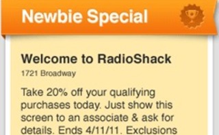 On the new app, there are seven types of “specials” that retailers can use. Radio Shack’s campaign entails a “Check-in Special” and a “Newbie Special.” For the latter, users who have never before checked into a Radio Shack get 20 percent off qualifying purchases for doing so. Non-newbies can get 10 percent off, while “mayors” get 20 percent.