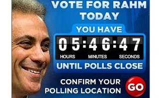 Google and Yahoo ads telling voters to “Vote for Rahm Emanuel Now” are targeted to people in Chicago searching for “mayor” related keywords today. The ads link to a campaign site page allowing voters to confirm their polling locations.