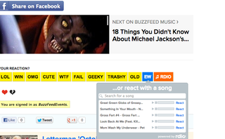During the promotion, site visitors will be able to react to stories by choosing a music track from a rotating selection curated by BuzzFeed editors to relate to that story. BuzzFeed stories regularly include reaction buttons, letting users tag them with comments like “lol.” Hovering over a new Rdio button at the end of the comment tags brings up the selected playlist. Users can stream the songs from within the popup or search for songs they think relate to the content.