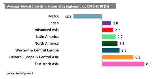 A look at Zenith predictions for global ad spend growth puts Fast Track Asia (China, India, Indonesia, Malaysia, Pakistan, Philippines, Taiwan, Thailand and Vietnam), as the region with the highest annual growth over the coming years. This is despite repercussions from a slowdown in the Chinese economy, which has seen growth predictions for this region drop from 11.9% a year between 2010-2015 to 8.5% a year between 2015-2018.