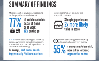 “…three of four mobile searches trigger additional actions. These range from open-ended actions like additional research (36%) or a website visit (25%), to more concrete conversions like a store visit (17%), a purchase (17%), or a phone call (7%). On average, each mobile search triggers nearly two actions…”