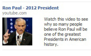 The ad linked to a lengthy 12-minute video on YouTube featuring a clickable button that allows people to post a message in support of Paul on their Facebook pages. An “Endorse Ron Paul” button displayed at the end of the video enables a video share on Facebook. The video has been viewed around 33,000 times since it was posted December 21, two days after Endorse Liberty filed with the FEC.